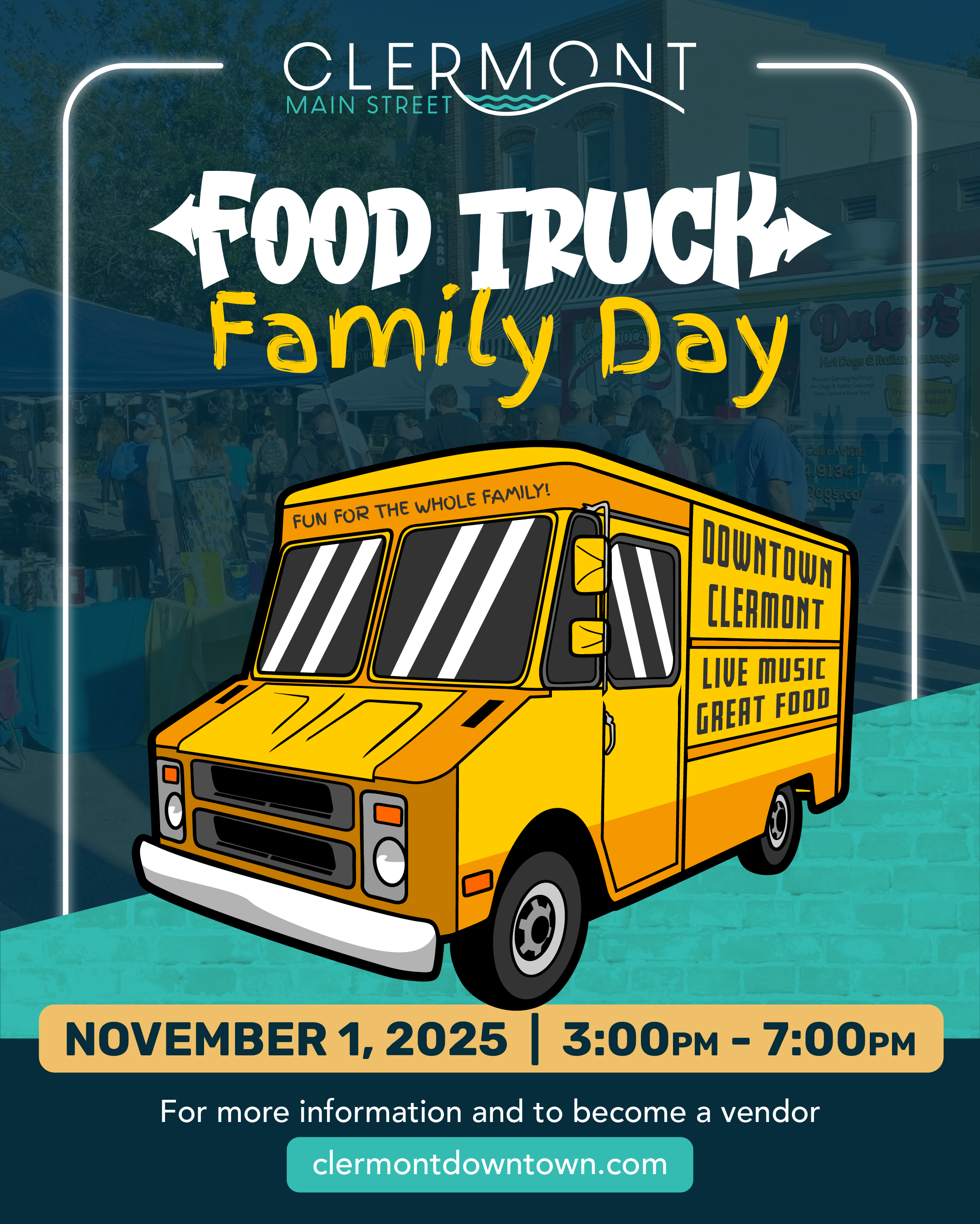Nov 1 Food Truck Family Day - Clermont Saturday, November 1, 2025 3:00 PM 7:00 PM Google Calendar ICS View Event →